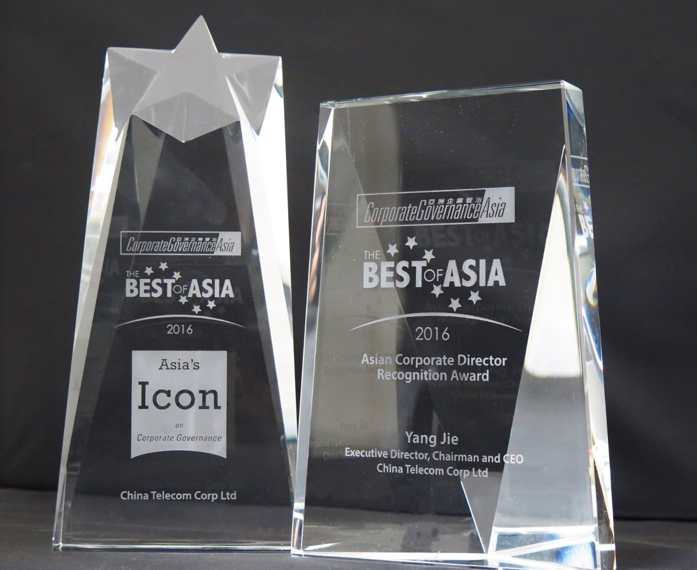 中国电信股份有限公司在《Corporate Governance Asia》杂志2016年亚洲最佳企业管治评选中,获评选为「亚洲最佳公司 - 企业管治典范」。此外,董事长兼首席执行官杨杰先生获颁发「2016年亚洲区最佳公司董事」奖项。