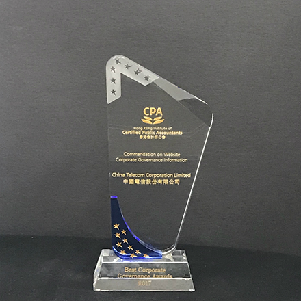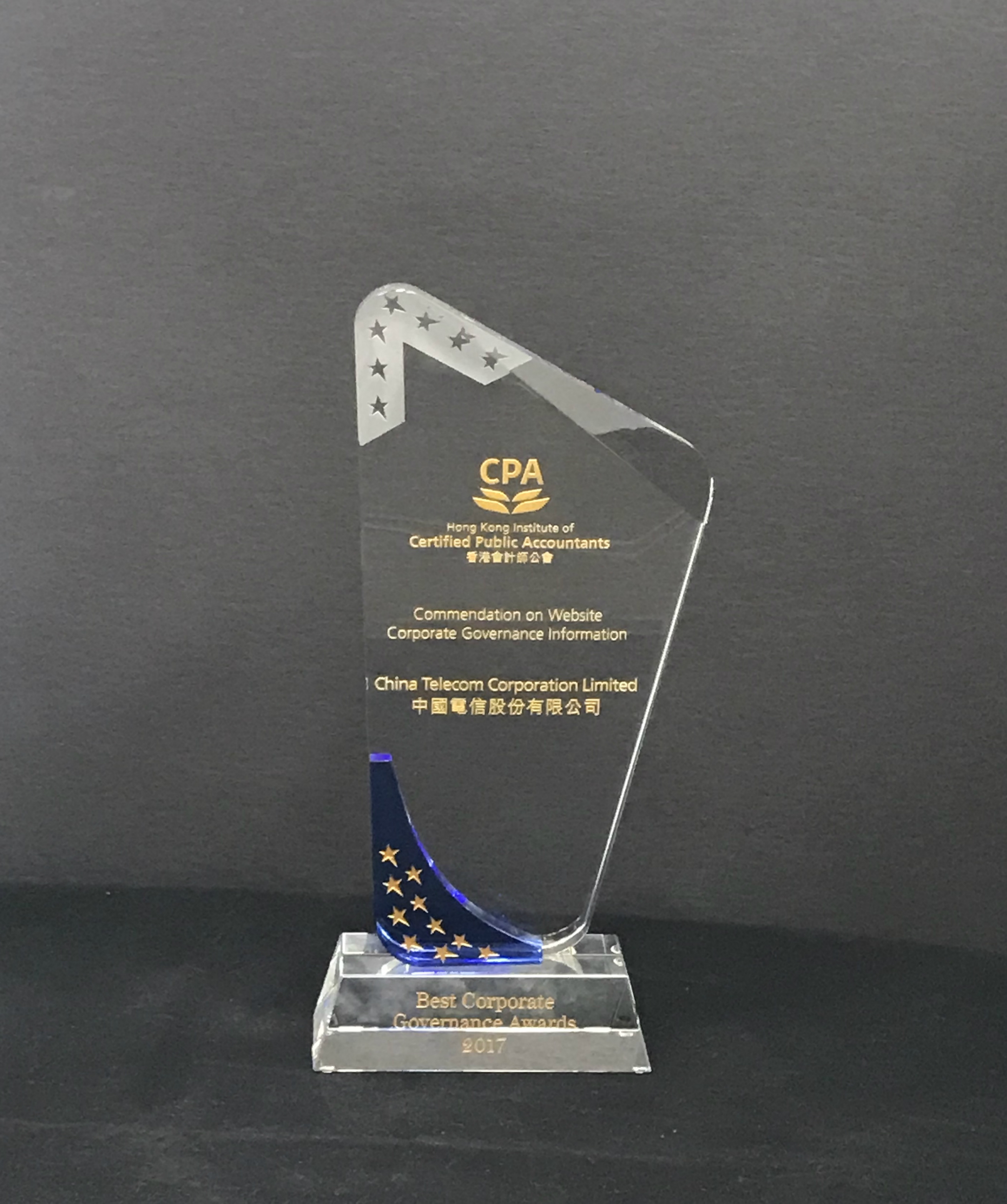 中国电信股份有限公司荣获香港会计师公会颁发「2017年度最佳企业管治大奖」中的「网上传递管治资讯嘉许奖」。