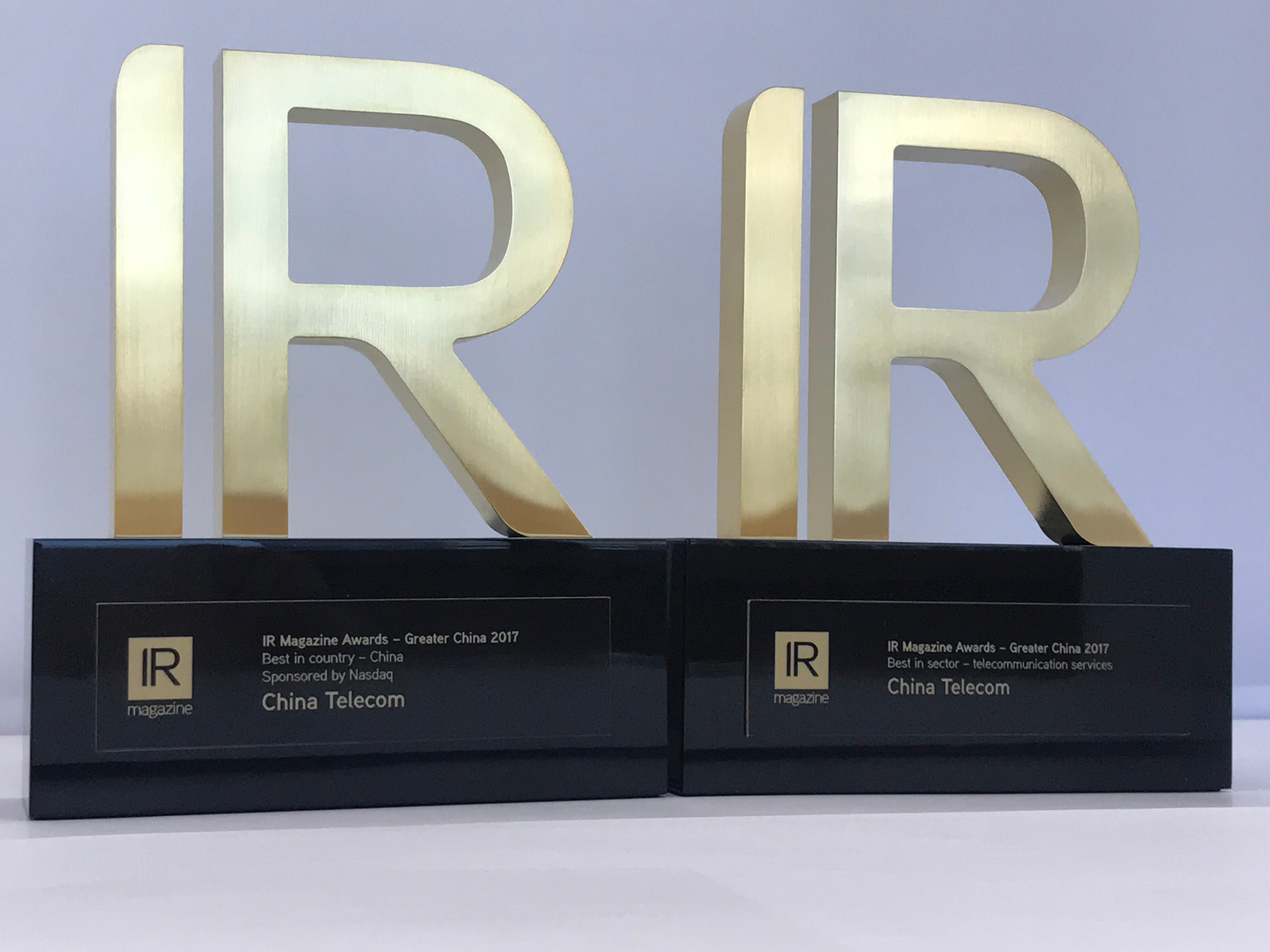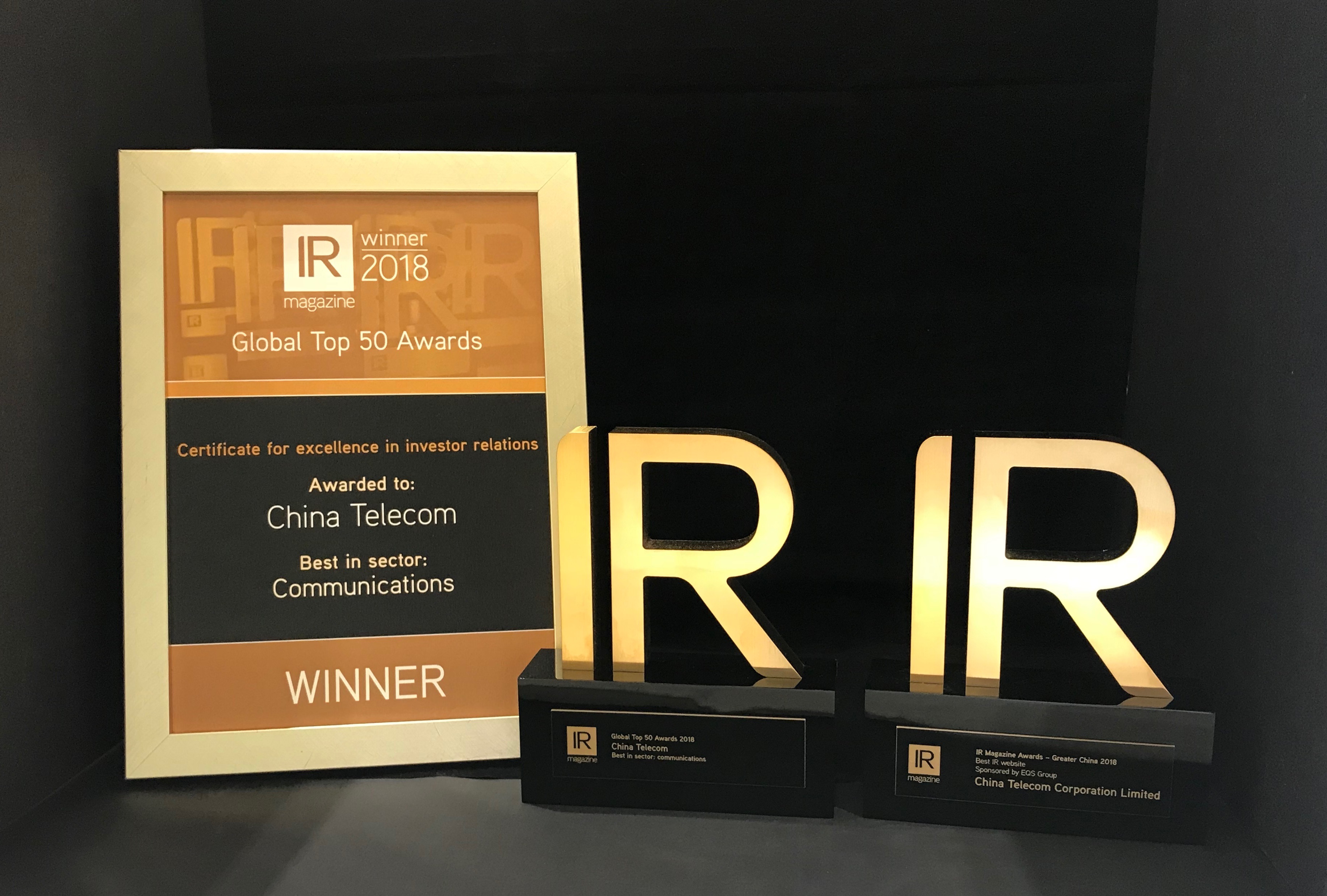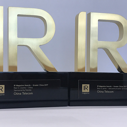 中国电信在2017《投资者关系杂志》(IR Magazine)大中华区奖项评选中,力压区内一众大型企业,获选为「中国最佳投资者关系公司」。另外,公司在竞争激烈的行业奖项中获评选为「电信服务业最佳投资者关系公司」,获提名的企业包括区内大型的电信服务供应商及领先的电信基础建设服务供应商。