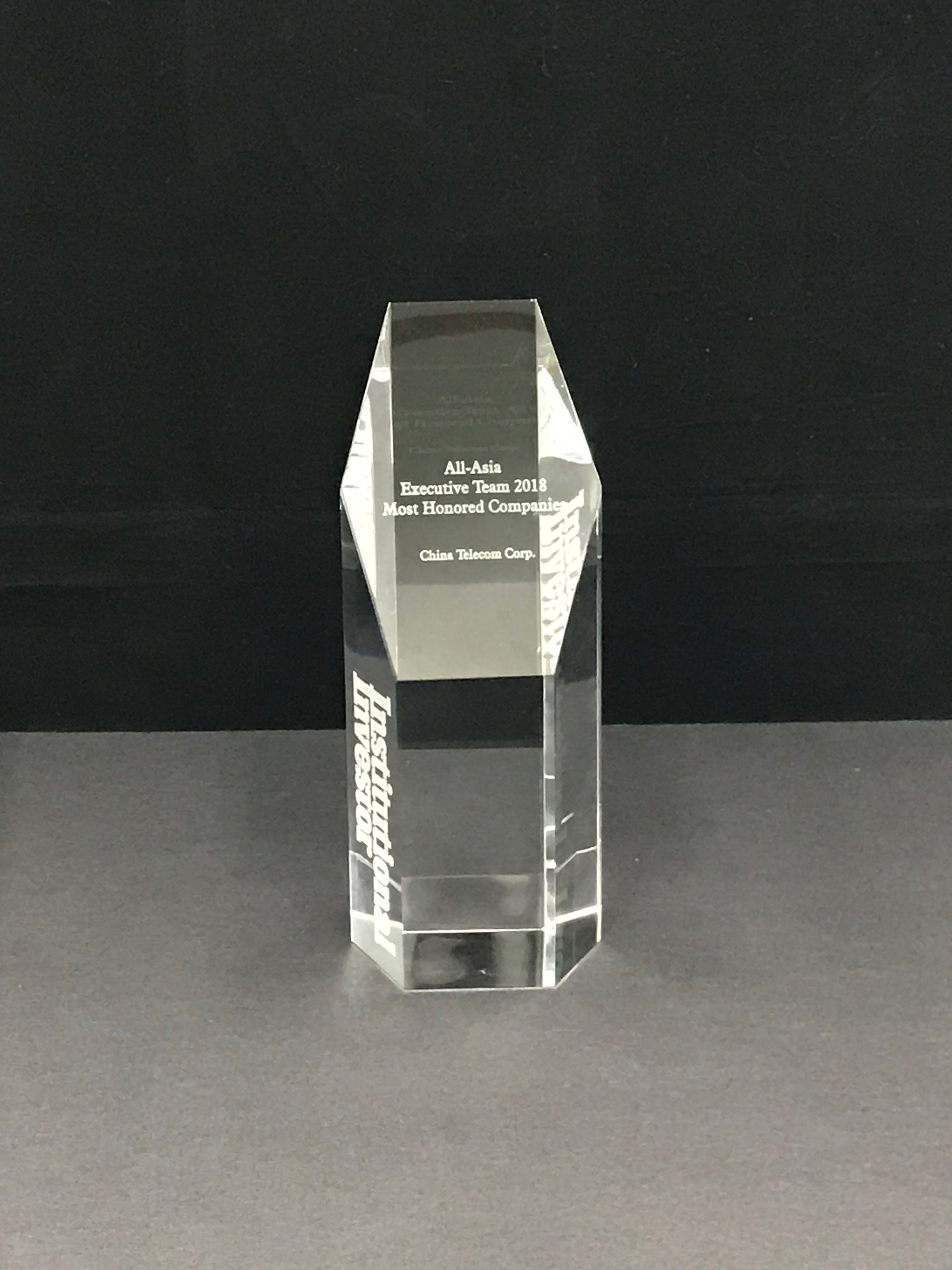 中国电信股份有限公司在著名财经杂志《机构投资者》(Institutional Investor)的2018年「亚洲最佳企业管理团队」评选中,欣然获选为「亚洲最受尊崇企业」。公司在该评选的八年历史中,每年均荣获这个奖项。本次评选收到来自破纪录的逾3,500名买方投资者及近1,000名卖方分析师(其管理的除日本以外亚洲区股票资产总规模估计达16,000亿美元)的投票,以评比区内表现杰出的企业及管理团队。中国电信及其管理层亦在电信业多个范畴中名列三甲位置,包括: