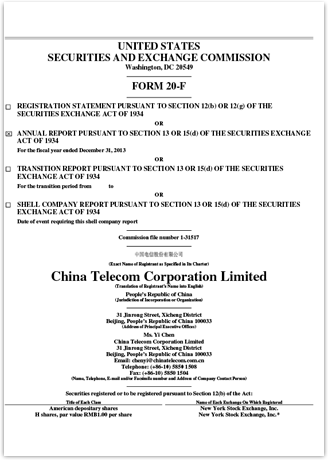 请注意:中国电信股份有限公司(「公司」)将应要求免费向任何股东提供公司经审计的全部财务报表的纸质版本,该财务报表已载于公司2013年12月31日截止年度的20-F表年报上。若有股东希望获取该财务报表的纸质版本,请向中国电信股份有限公司投资者关系部索取(地址:香港湾仔告士打道108号光大中心38楼;电邮:ir@chinatelecom-h.com;电话:852-2877-9777;传真:852-2877-0988)。
