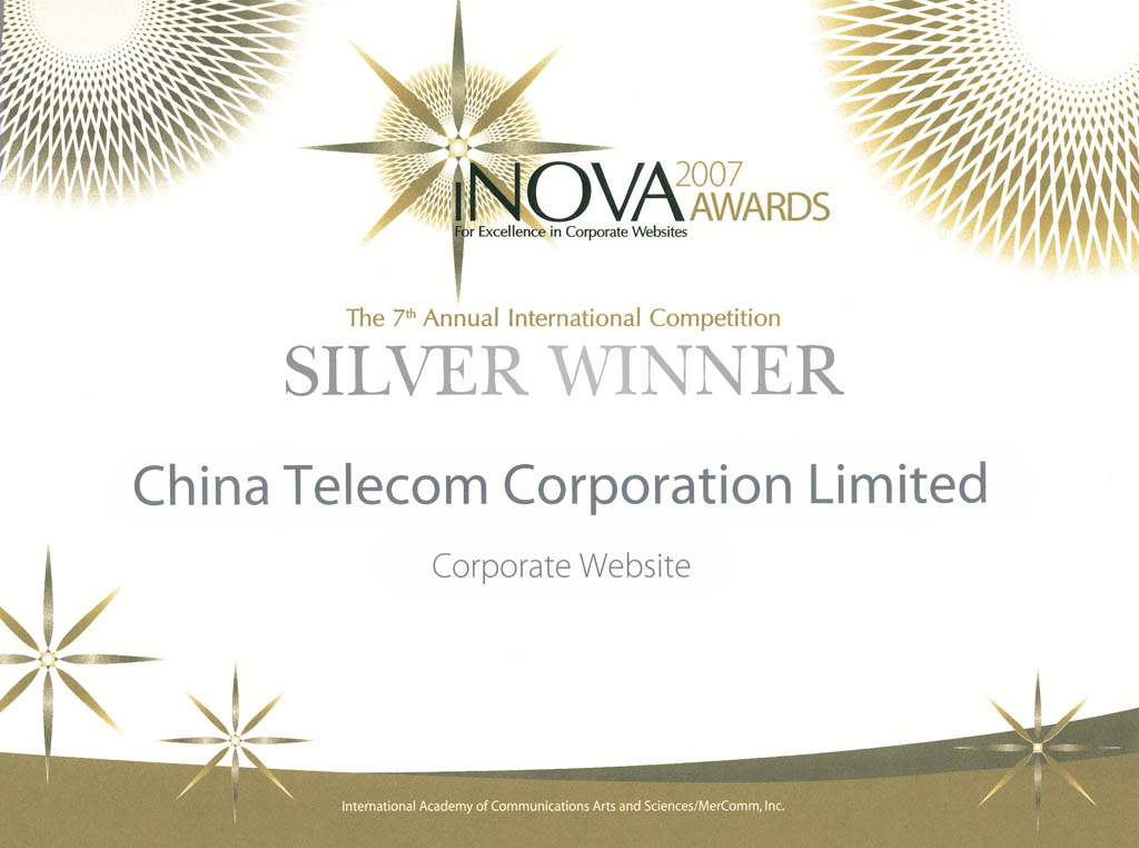 中國電信股份有限公司網站(www.chinatelecom-h.com)在美國紐約舉行的國際著名網站評選《iNova Awards》中獲得銀獎。