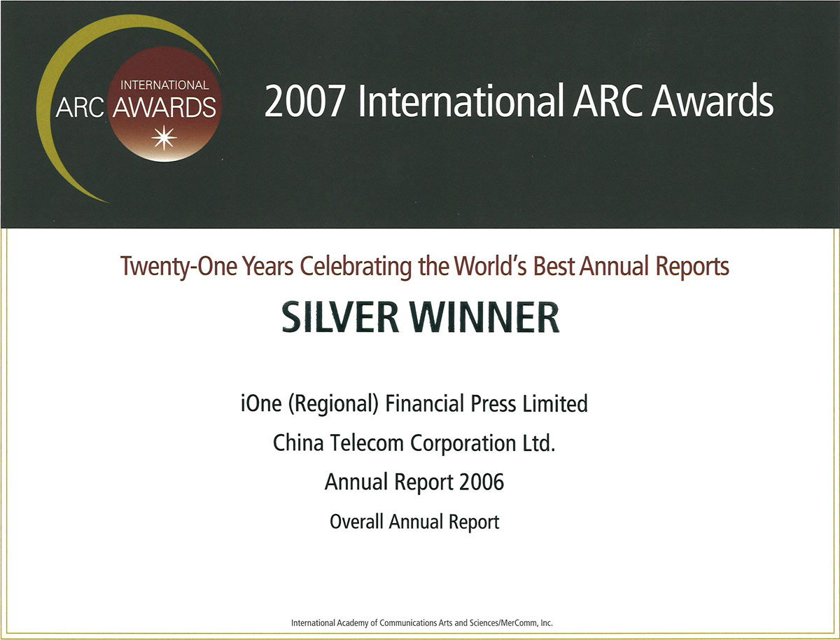 中國電信股份有限公司2006年年報在國際權威年報評選《2007年度國際ARC大獎》中,再次榮獲《亞太區電信公司組別》年報銀獎。