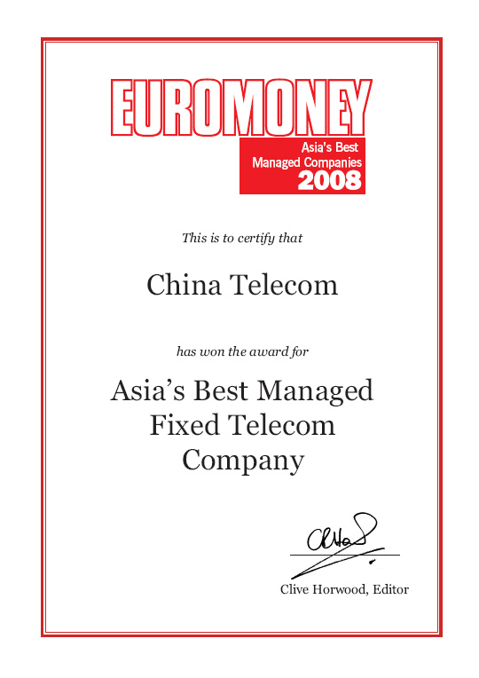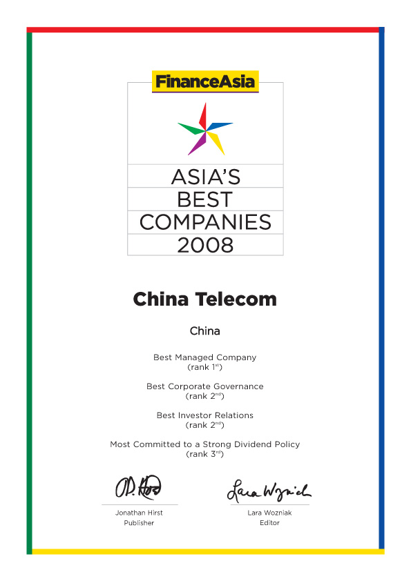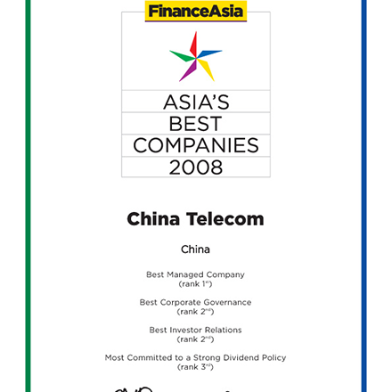 中國電信股份有限公司在《亞洲財經》2008年度亞洲最佳公司評選中,獲選為中國最佳管理公司。此外,公司亦在中國最佳企業治理公司,排名第二位;中國最佳投資者關係公司,排名第二位;中國最佳股息承諾公司,排名第三位,合共獲得四個獎項。