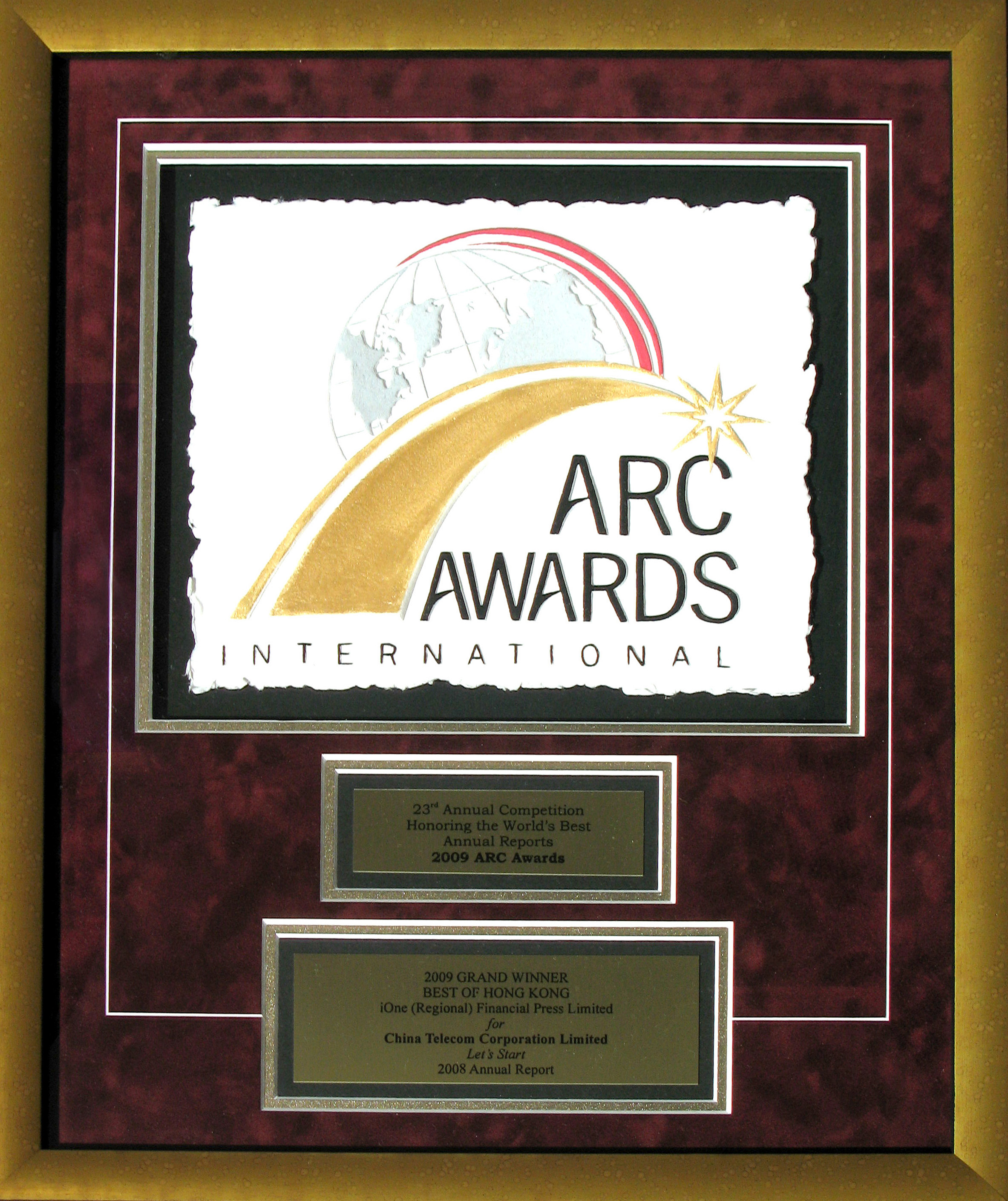 中國電信股份有限公司2008年年報在國際權威年報評選《2009年度國際ARC大獎》中,榮獲其行業組別整體年報金獎。此外,在各獲獎年報的星中之星評選中,同時榮獲最佳香港上市公司年報至尊大獎(第一名)。