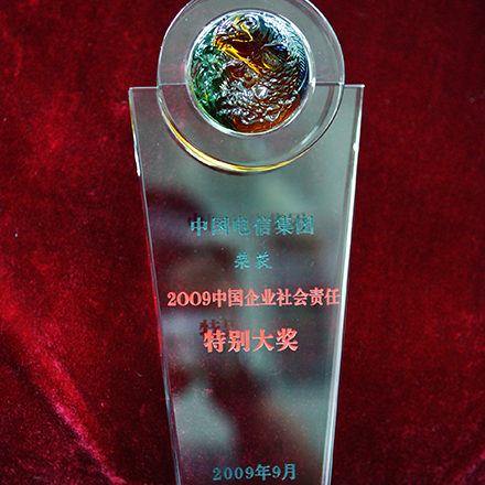 中國電信榮獲《中國企業CSR研究中心》頒發「2009中國企業社會責任特別大獎」,成為唯一獲得此獎項的通信企業。該獎項的評審準則主要是根據企業的公司治理和道德價值、就業與員工權益保護、環境保護與節能減排、產品質量管理、消費者權益保護、供應鏈夥伴關係、推動中國科技進步、稅收貢獻指數、科學規範的責任管理體系、公眾形象等。