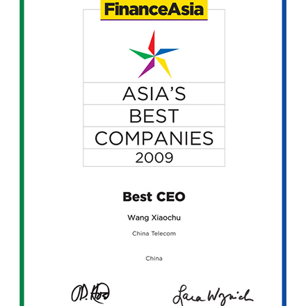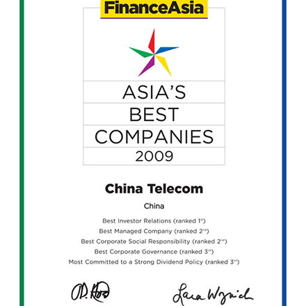 中國電信在亞洲財經雜誌《The Asset》2009年 "最具潛力中國企業" 評選中,獲評選為電信行業組別最佳公司第一名。