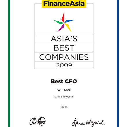 在《金融亞洲》(FinanceAsia) 舉辦的 "亞洲最佳公司評選" 中,中國電信股份有限公司董事長兼首席執行官王曉初先生獲選為中國區 "最佳首席執行官",公司財務總監吳安迪女士獲選為 "最佳財務總監"。與此同時,中國電信榮獲以下中國區獎項: