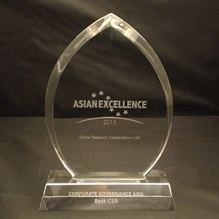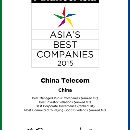 中國電信股份有限公司在亞洲著名企業管治專業雜誌《Corporate Governance Asia》舉辦的「2015年度亞洲卓越企業表揚大獎」中榮獲以下企業管治大獎: