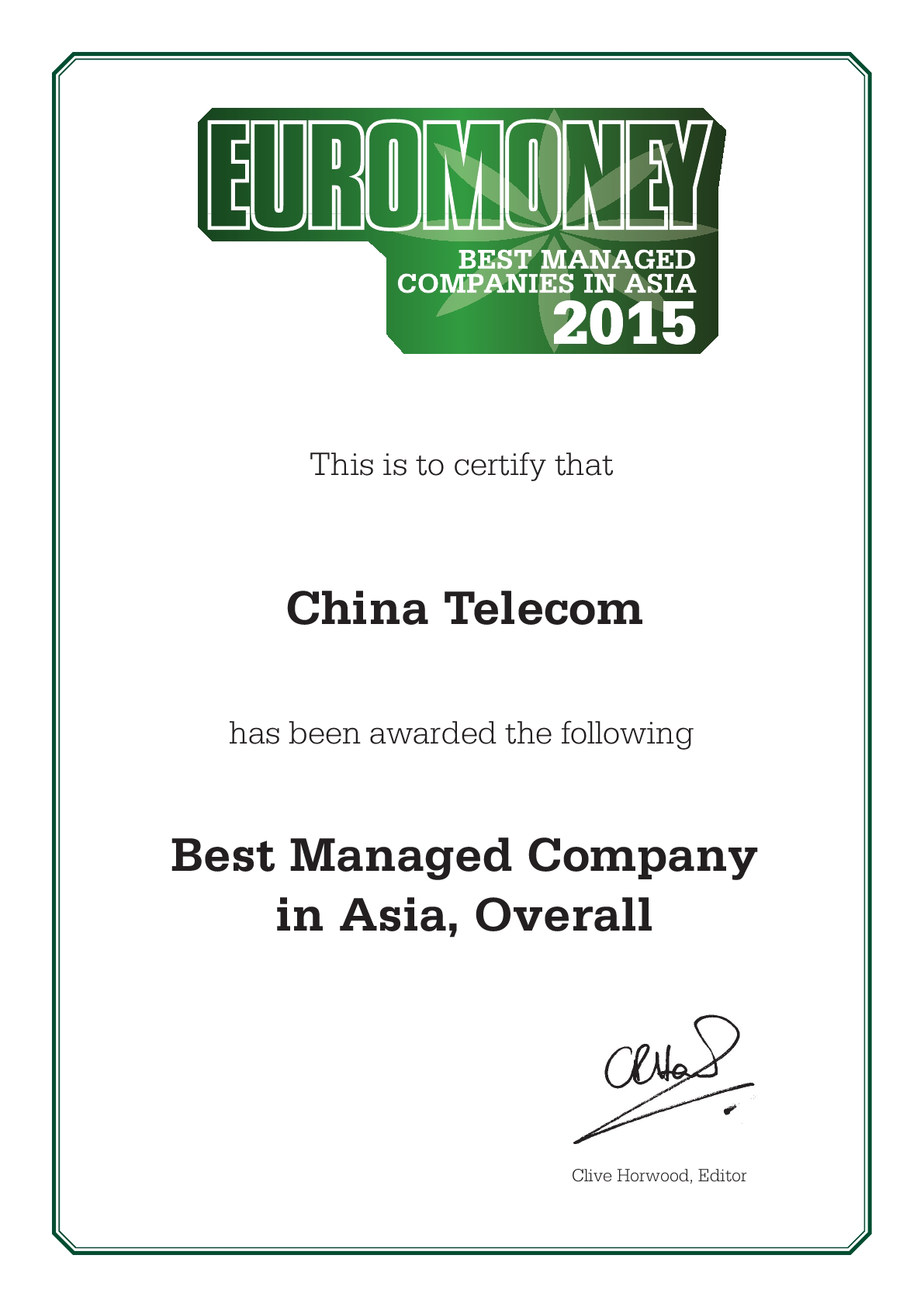 中國電信股份有限公司在《Euromoney》2015年度最佳管理公司評選中,連續六年獲來自全球不同地區領先的投資銀行及金融機構的投資分析師投票評選為「亞洲最佳管理公司第一名」。同時,中國電信在評選中亦榮獲「亞洲電信業最佳管理公司第一名」。