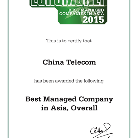 中國電信股份有限公司在《Asiamoney》2015年度最佳管理公司評選中,獲分析師及投資者投票評選為「中國最佳管理大型企業」。
