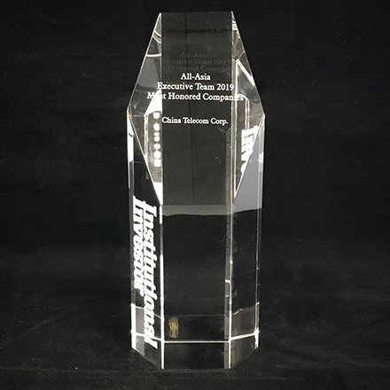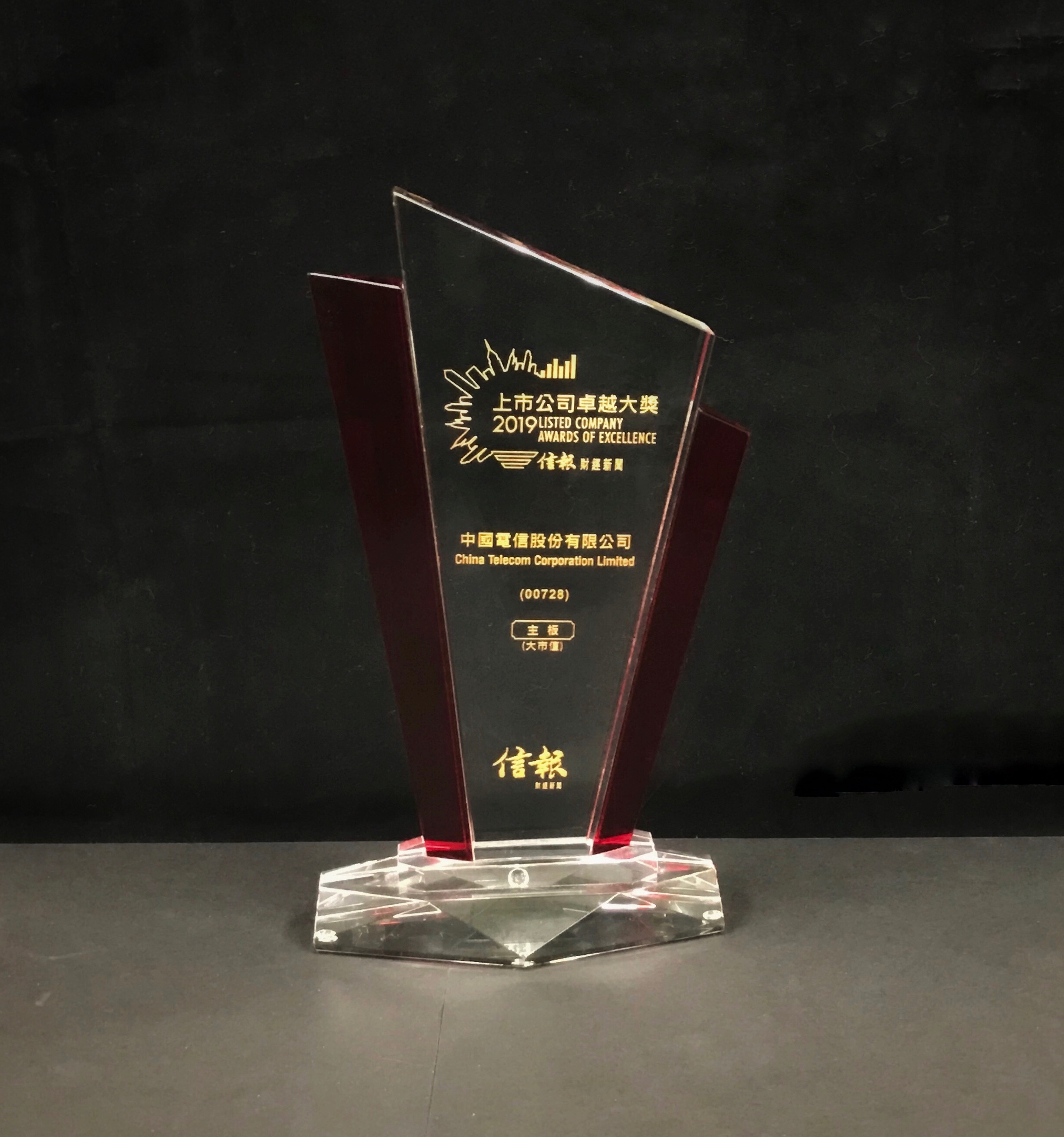 中國電信股份有限公司在著名財經雜誌《機構投資者》(Institutional Investor)舉辦的2019年「亞洲最佳企業管理團隊」評選中,獲選為「亞洲最受尊崇企業」。公司在該評選的九年歷史中,每年均榮獲這一殊榮。本次評選收到來自逾1,800名買方投資者及逾600名賣方分析師的投票,以評比區內表現傑出的企業及管理團隊。此外,中國電信及其管理層在「電信業」多個獎項中均名列第二,包括: