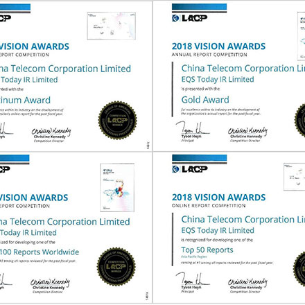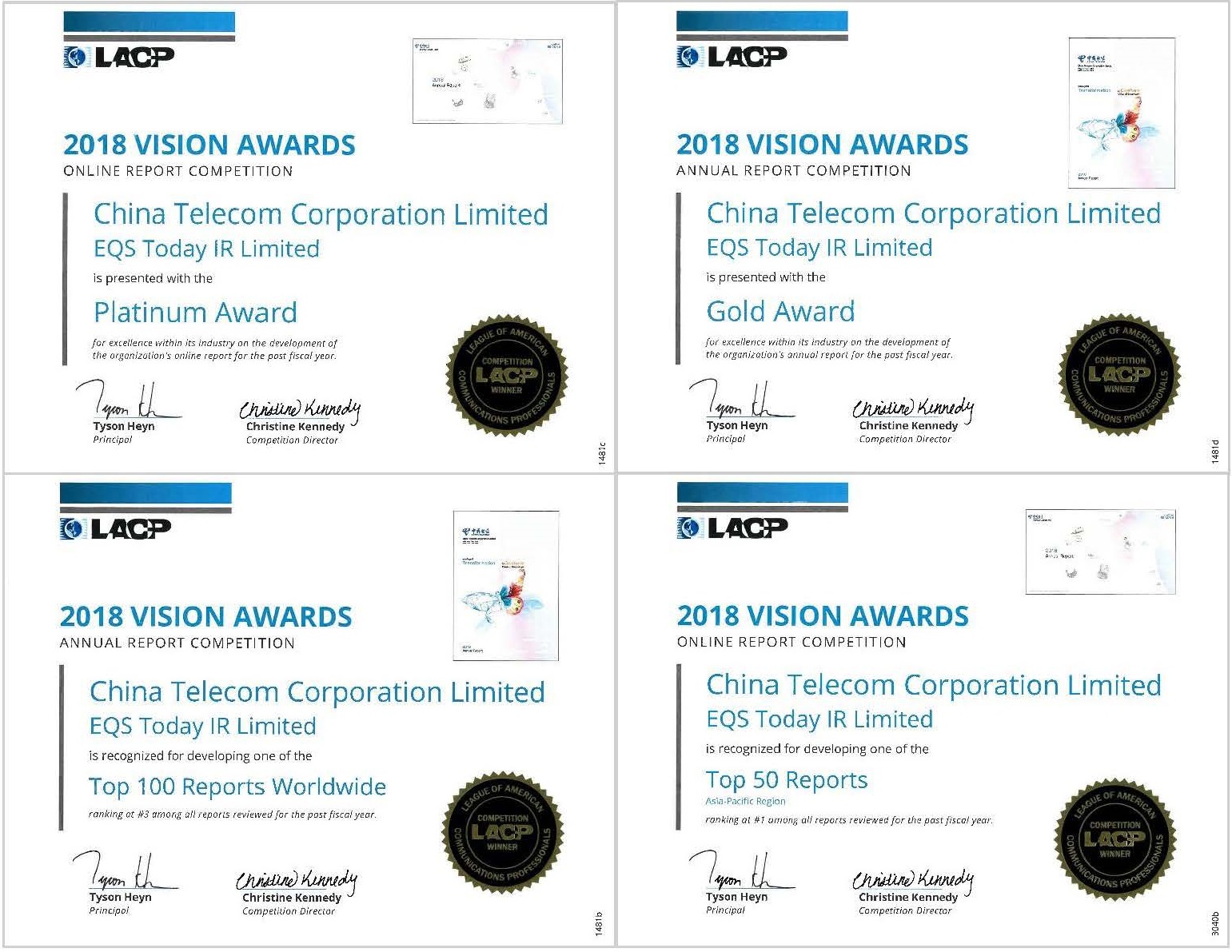 中國電信股份有限公司二零一八年報《成就智能蛻變 共享創新價值》的印刷版和網上版於美國傳媒專業聯盟(LACP)舉辦的「LACP 2018 Vision 大獎」中,榮獲共六項白金獎及五項金獎,並於「全球最佳100強年報」中排名第三位(亞太區排名第一),為公司歷年來參與該項年報評選所得的最佳獲獎記錄之一。此外,公司年報的印刷版於「2019年國際ARC大獎」評選中,獲得三項金獎。