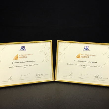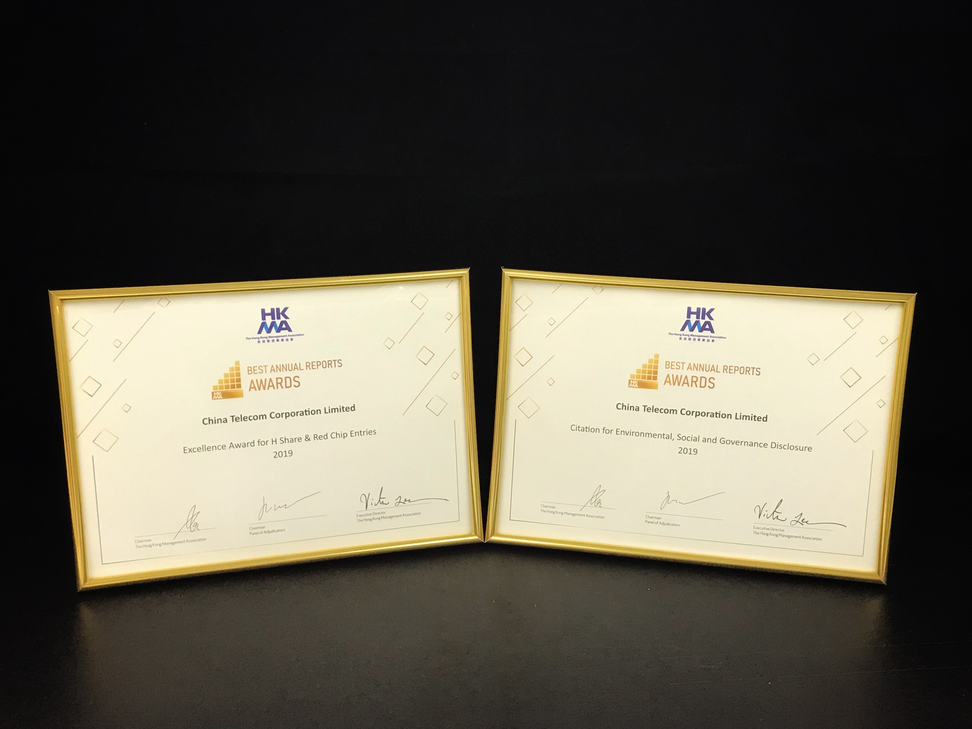 中國電信股份有限公司二零一八年報《成就智能蛻變 共享創新價值》於香港管理專業協會「2019年度最佳年報大獎」榮獲「優秀H股及紅籌公司年報獎」及「優秀環境、社會及管治信息披露獎」兩項殊榮。
