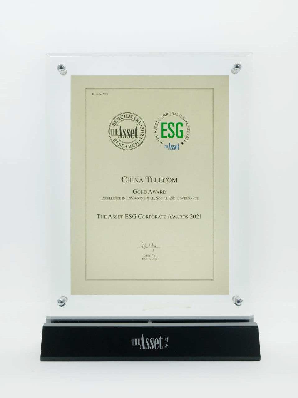 亞洲著名財經雜誌《The Asset》所舉辦的「2021年ESG企業大奬」至今已第21屆,為亞洲區內舉辦歷史最悠久的環境、社會及管治獎項。「企業金奬」表揚公司在財務表現、管理、企業管治、社會責任、環境保護和投資者關係等全部範疇的出色表現。中國電信獲得本次殊榮,足以證明公司在環境保護、社會責任、企業管治等方面的優秀表現。