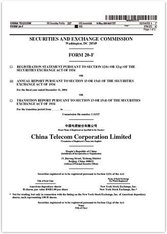 請注意:中國電信股份有限公司(「公司」)將應要求免費向任何股東提供公司經審計的全部財務報表的紙質版本,該財務報表已載於公司2004年12月31日截止年度的20-F表年報上。若有股東希望獲取該財務報表的紙質版本,請向中國電信股份有限公司投資者關係部索取(地址:香港灣仔告士打道108號光大中心38樓;電郵:ir@chinatelecom-h.com;電話:852-2877-9777;傳真:852-2877-0988)。